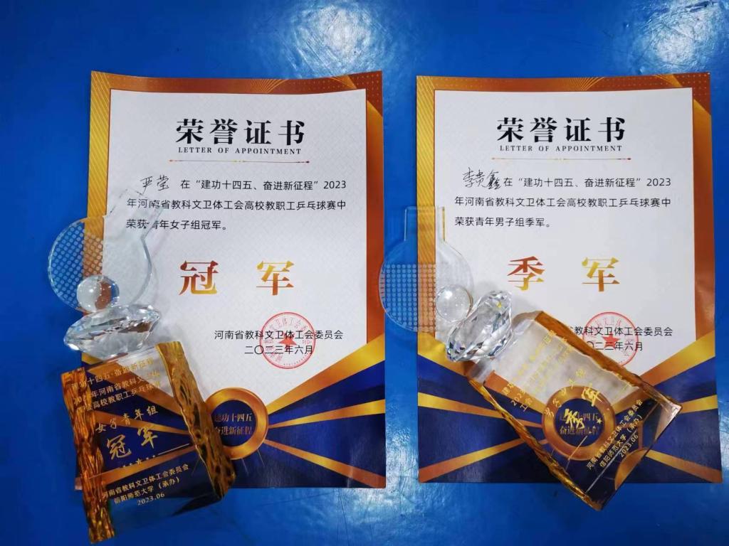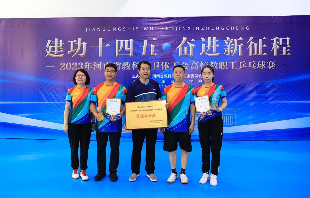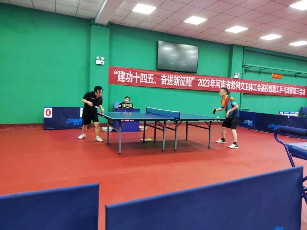 6月8日至11日,在信阳师范大学,由河南省教科文卫体工会主办的“建功十四五、奋进新征程”2023年河南省教科文卫体系统职工乒乓球比赛在信阳师范学院举行,来自全省高校38个代表队200余人参加了比赛。我校由副校长张国臣,体育部教师严莹、李贵鑫,理学部教师潘全香组成运动员代表队,由校工会副主席许振兴领队。