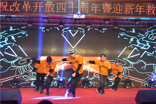 三句半《迎新年》、《后勤五步曲》,情景剧《我的乖》表达了全校教师为学校发展和学生成长成才奉献青春的豪迈激情,展现出我校师生在过去一年中齐心协力、锐意进取的风貌;现代舞《Making you dangcing》节奏明快、律动十足,充分展示了青年教师活泼靓丽的青春风采;歌曲《风吹麦浪》、《礼仪之邦》、《走在乡间的小路上》、《说唱脸谱》、《祖国万岁》和钢琴弹唱《歌曲串烧》婉转动听,或高昂激越或清丽明媚;校领导班子倾情合唱《歌唱祖国》,台下师生也起立共同合唱,用嘹亮歌声表达对祖国繁荣昌盛的美好祝愿,推动晚会气氛走向高潮。晚会在歌曲《难忘今宵》中完美落下帷幕。