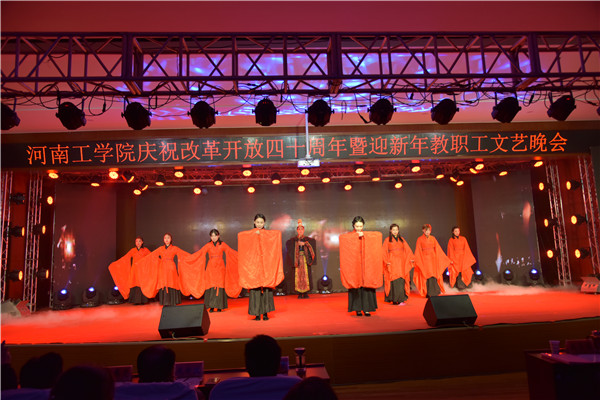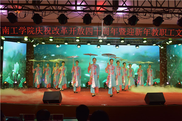 报告厅灯光璀璨,伴随着欢快的舞姿,晚会在美仑美奂的舞蹈《盛世花开》中拉开了序幕。整场晚会综合运用歌曲、舞蹈、相声、诗朗诵、情景表演等舞台手段,生动再现了40年来气势恢宏的山河巨变,形象反映了40年来中国共产党引领中华民族向着复兴梦想奋斗的壮阔征程。武术表演《惊鸿》英姿飒爽,一招一式尽显中华雄风;诗朗诵《春天里的中国》再现了改革开放以来中国翻天覆地的变化,抒发了全国各族人民对改革开放“深深的感激与永恒的敬意”。 相声《水课与金课》诙谐幽默、妙语连珠,表达了我校教师与时俱进、勇于创新的精神风貌;模特秀《茉莉花》以自信优雅的舞步展现我校女教工的古典美韵;