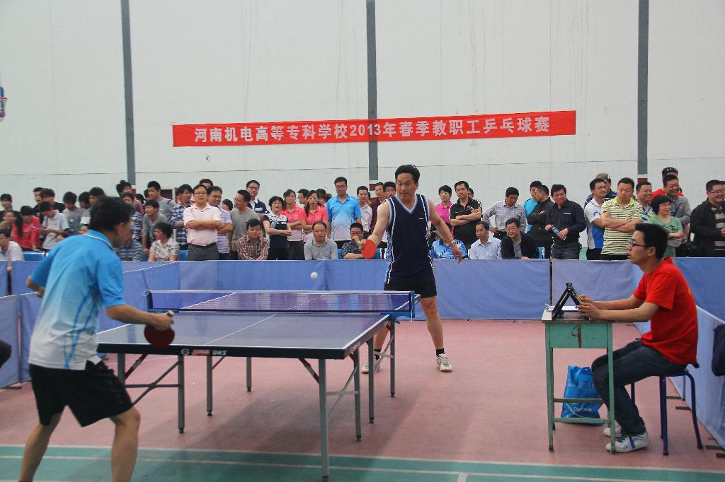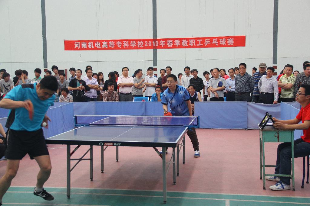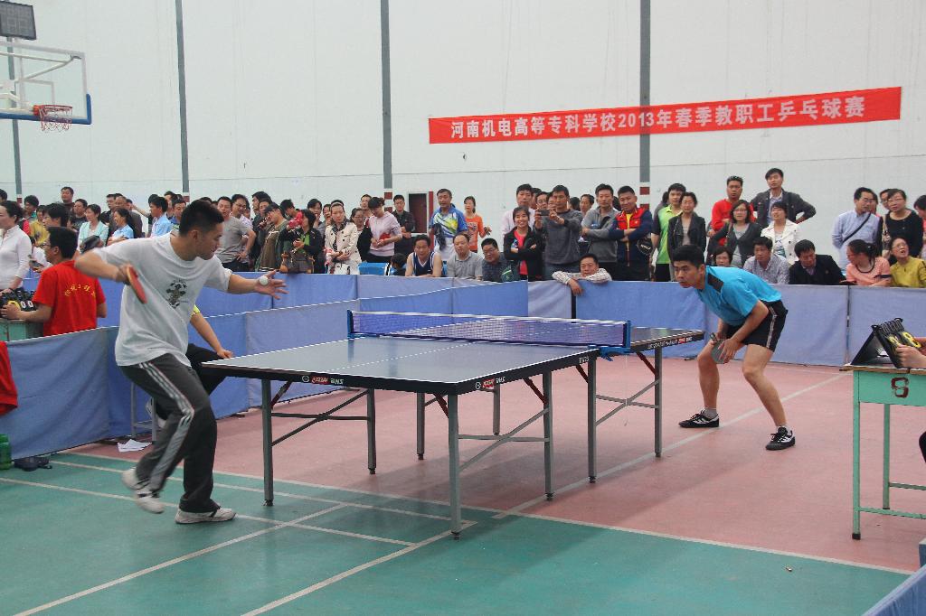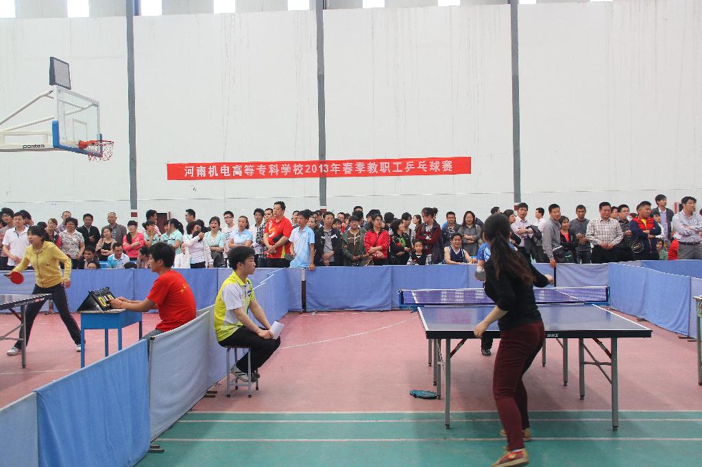 为进一步丰富教职工的业余文化生活,加强教职工的相互交流,提高乒乓球爱好者的竞技水平和综合素质,2013年5月3日由校工会主办,基础部承办的2013年教职工乒乓球比赛在我校“静苑球类馆”正式开赛。本次校乒乓球比赛为团体对抗赛。赛前各分会积极备战,精心挑选,共选拔出一百多名教职工参加了比赛。