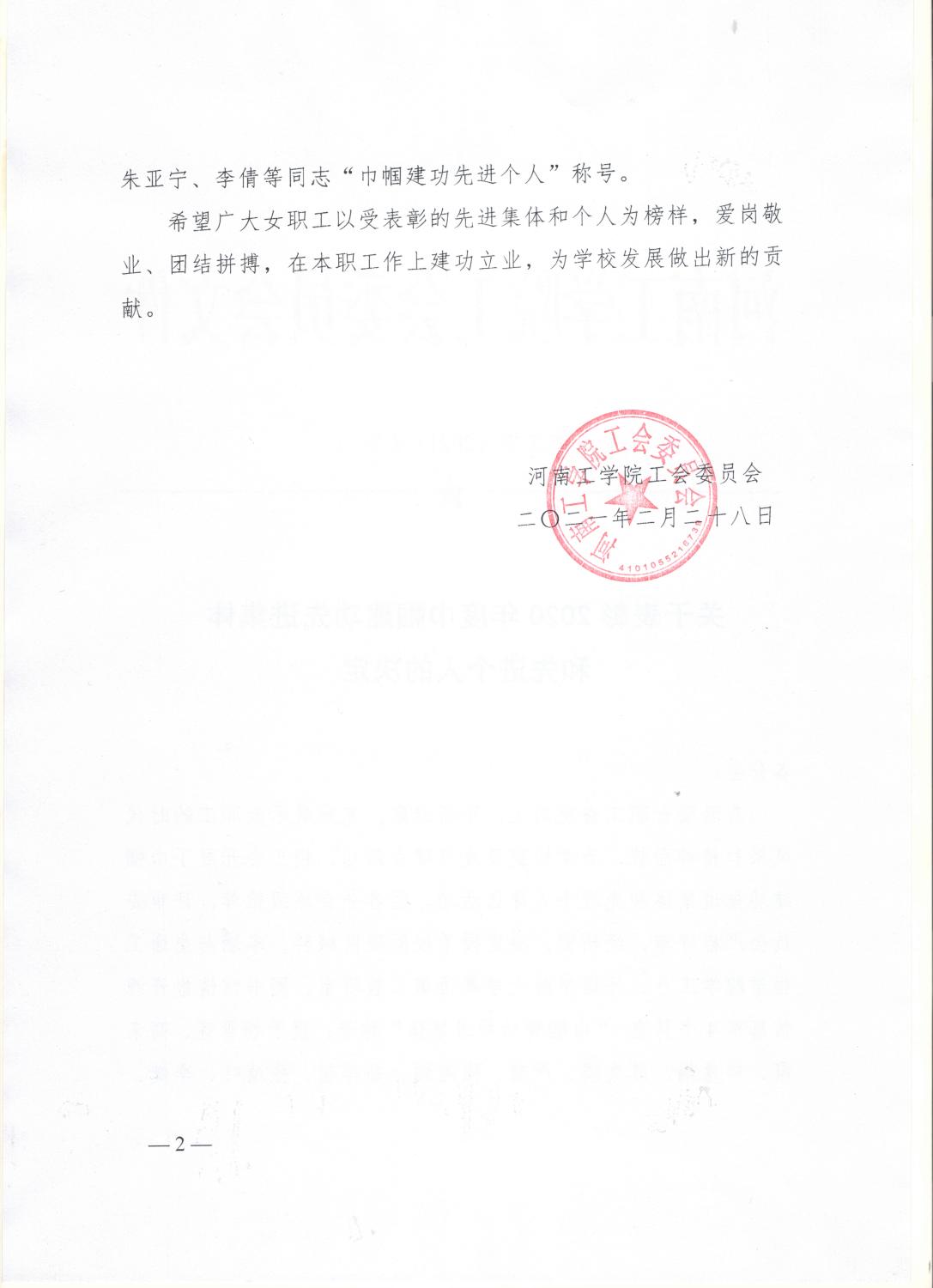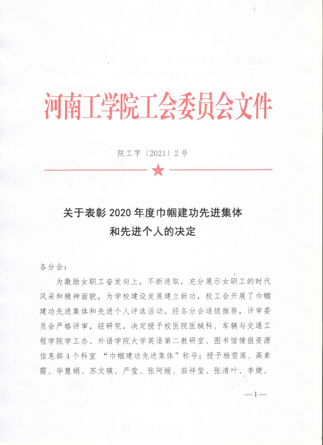 院工字〔2021〕2号 关于表彰2020年度巾帼建功先进集体 和先进个人的决定