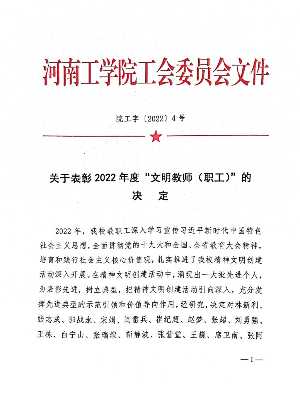 关于表彰2022年度“文明教师(职工)”的决定