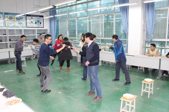 窗外寒风凛凛,室内热火朝天。2014年12月17日下午,在实字4#110教室,汽车工程系分工会举办2014年冬季趣味运动会。本次活动内容主要有筷子夹乒乓球传递、两人夹气球接力和“谁是卧底”三个项目。本次活动由系分工会主席段维峰同志总负责,全体教职工以教研室为单位参与,分为汽制、汽检、汽电、学工办四个小分队。