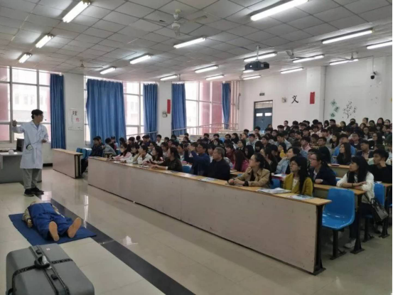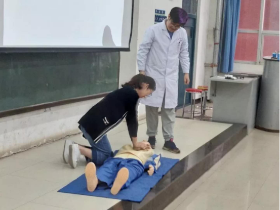 讲座中,许梦轩医师用通俗易懂的语言和专业示范动作,结合学校安全事故中的急救事例,从专业医学角度出发,详细讲解了急救中心肺复苏技术的操作步骤和要领,纠正了急救过程中几个常见的误区,并提醒大家在急救前务必先做好现场的安全评估,确定无危险因素后才可以接近病人救人。许医生还为大家展示了AED(自动体外心脏除颤仪)的正确急救法,并使用模型现场演示了单人心肺复苏的操作,从胸外按压、开放气道到口对口人工呼吸。同时又对中暑、酒精中毒、烧烫伤、创伤、心梗与脑梗等突发事件应急处理的急救知识与技能进行针对性地详细讲解,让全体师生掌握好急救技术要点及正确的操作方法。