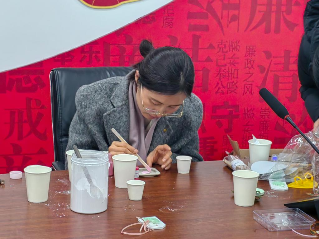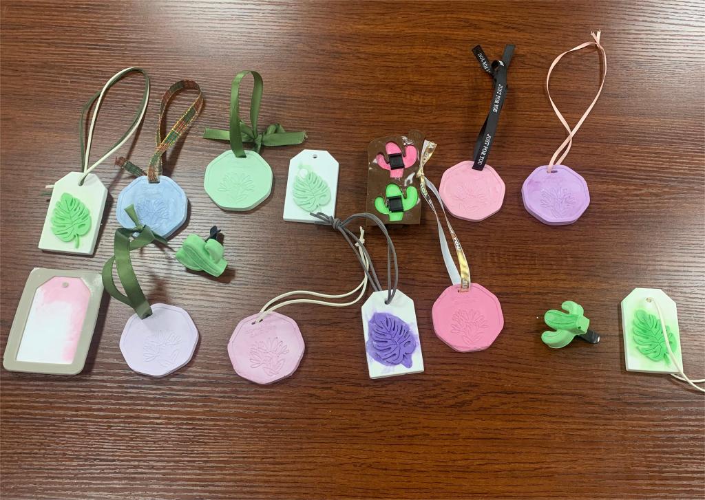活动开始前,主持人详细讲解了香薰DIY所需的原材料、使用步骤和制作流程。随后,在主持人的指导下老师们开始自由创作。通过搅拌、上色、注模、脱模等步骤,一个个精美又独一无二的香薰石膏牌逐渐呈现出来。石膏牌凝固后,再按照自己喜欢的样式和香味,系上丝带,滴上清香的精油,成为不仅具有芳香魅力,还能净化空气的小礼物。活动现场笑声阵阵,空间里弥漫着淡淡的香气。