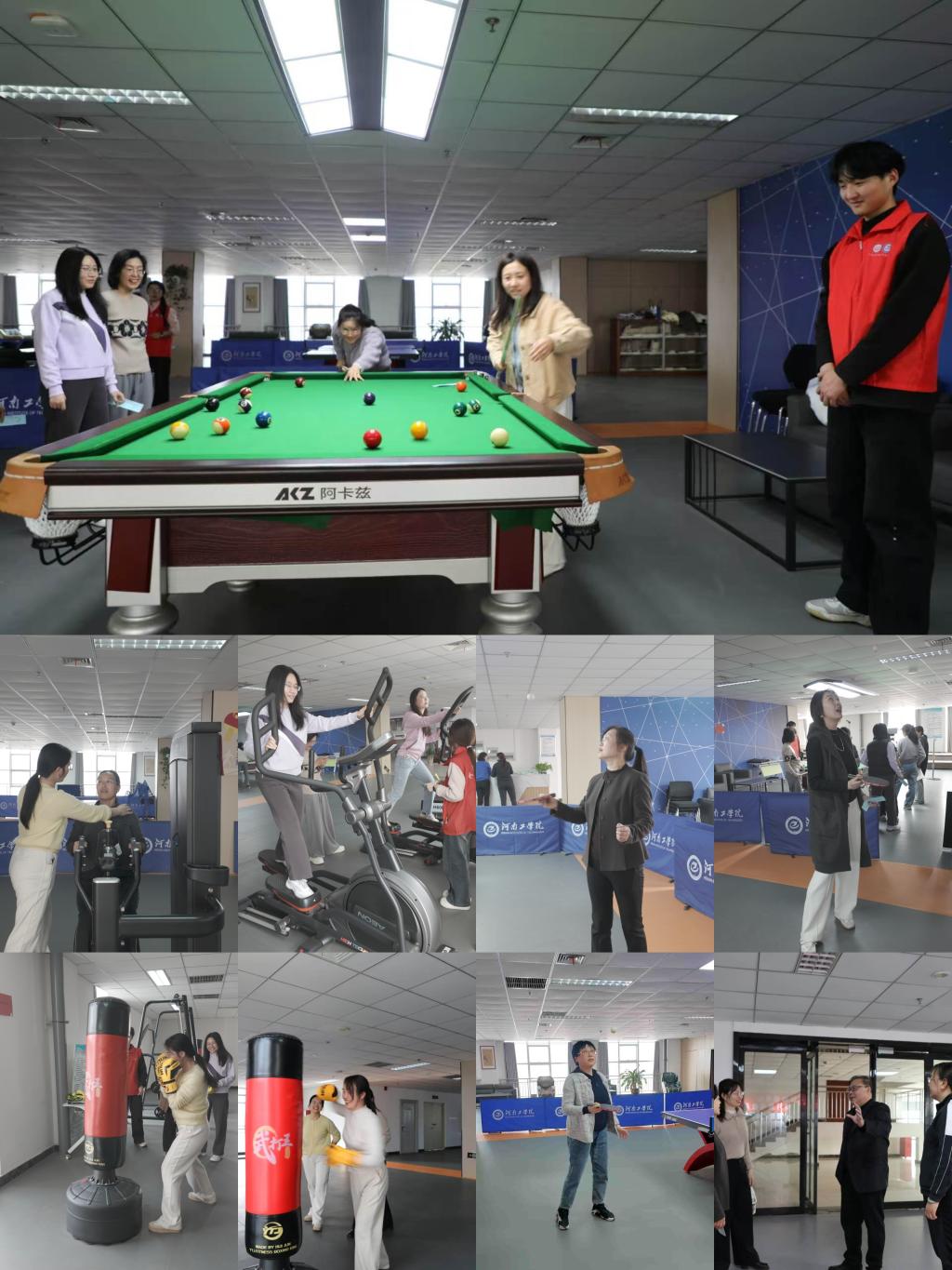 活动伊始,女教职工们准时到达现场领取活动打卡券,现场秩序井然。随后进入趣味健身游戏环节,女职工们自由参与“振臂划船”、“边走边看”、“我进球了”、“乒乓乒乓”、“马踏祥云”、“爆揍30秒”6项趣味运动,完成3项及以上即可打卡通关。游戏中,大家热情高涨:“振臂划船”考验力量与动作规范,15次标准动作完成后收获满满成就感;“边走边看”在椭圆机上轻松活动一分钟,感受运动乐趣;“我进球了”凭借台球技巧击打彩球,进三球即可通关;“乒乓乒乓”原地颠球20次不落地,考验专注力与协调性;“马踏祥云”3人一组开合跳30次,团队协作中迸发活力;“爆揍30秒”用减压拳暴击沙袋,释放压力的同时完成挑战。最后,女职工们凭打卡券领取节日小礼品,并集体合影留念,活动在温馨欢乐的氛围中结束。