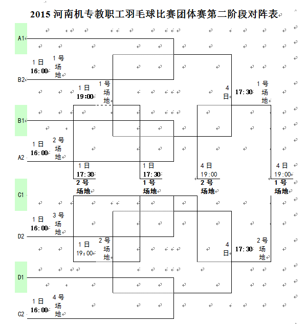 1.第一阶段:小组循环赛。 16个分会,分A、B、C、D四组进行小组循环赛,小组循环赛采用3场2胜,出场顺序是男单、混双、男双(不能兼项),每场比赛3局2胜,每局21分制。各小组前两名晋级第二阶段。
